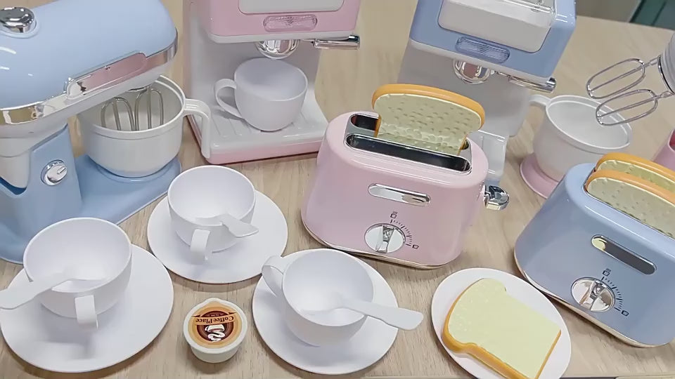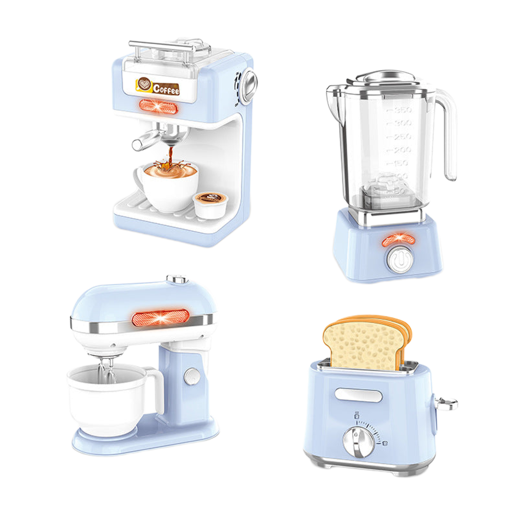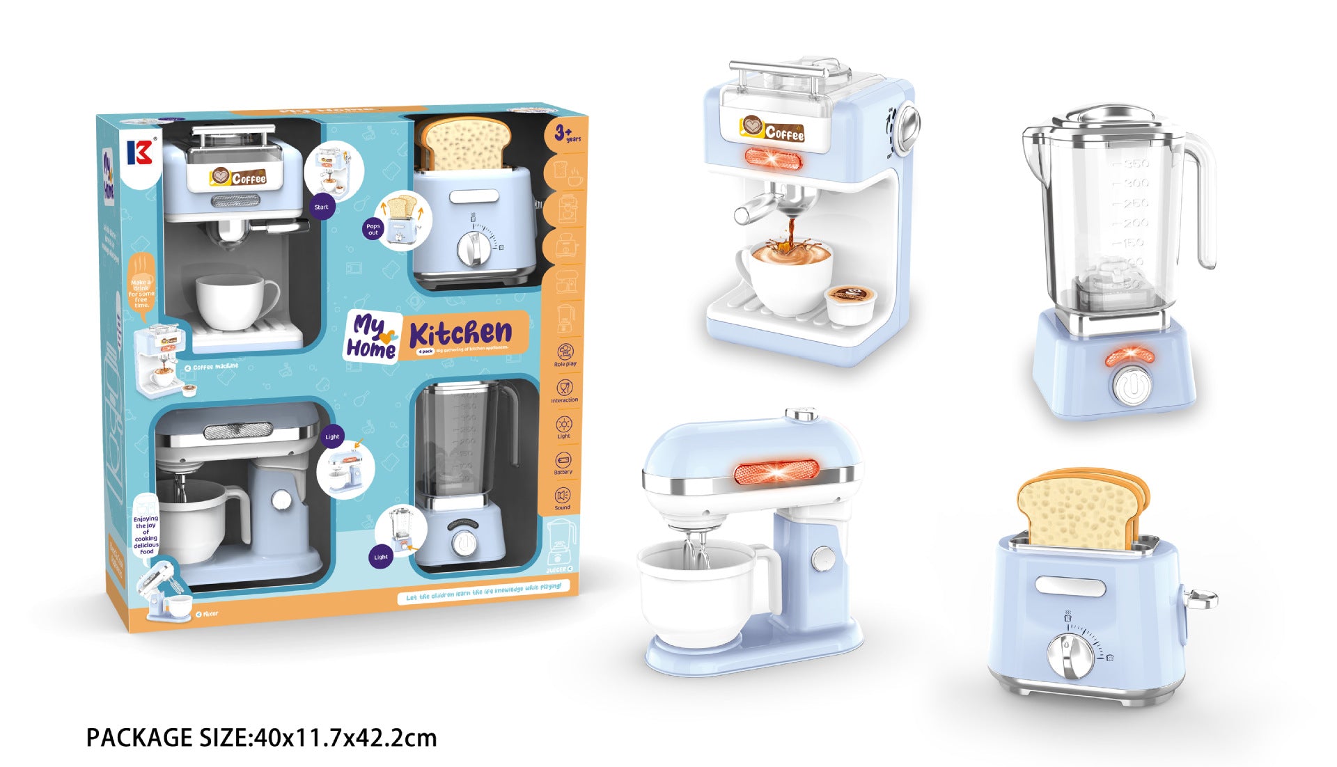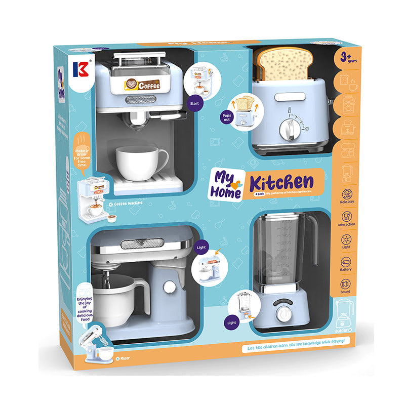 ოთხი ერთში კომპლექტი ელექტრო ყავის აპარატი, წვენსაწური, კვერცხის სათქვეფი, პურის აპარატი, პლასტმასის სათამაშო სასაჩუქრე ყუთი გოგონებისთვის
