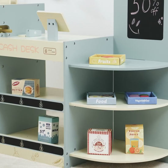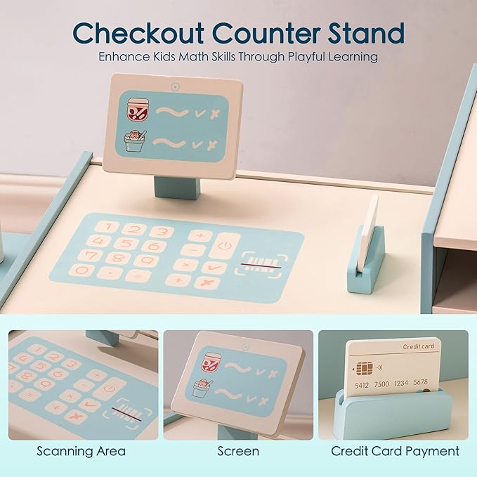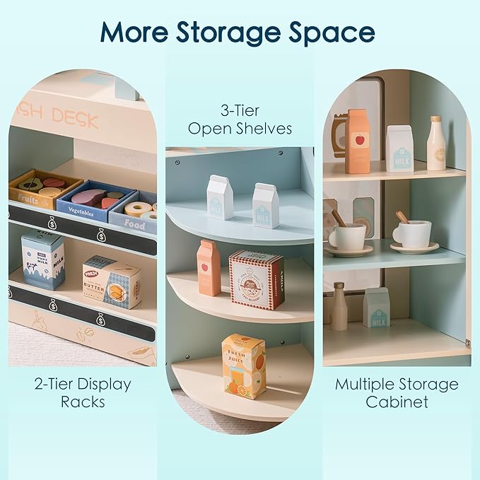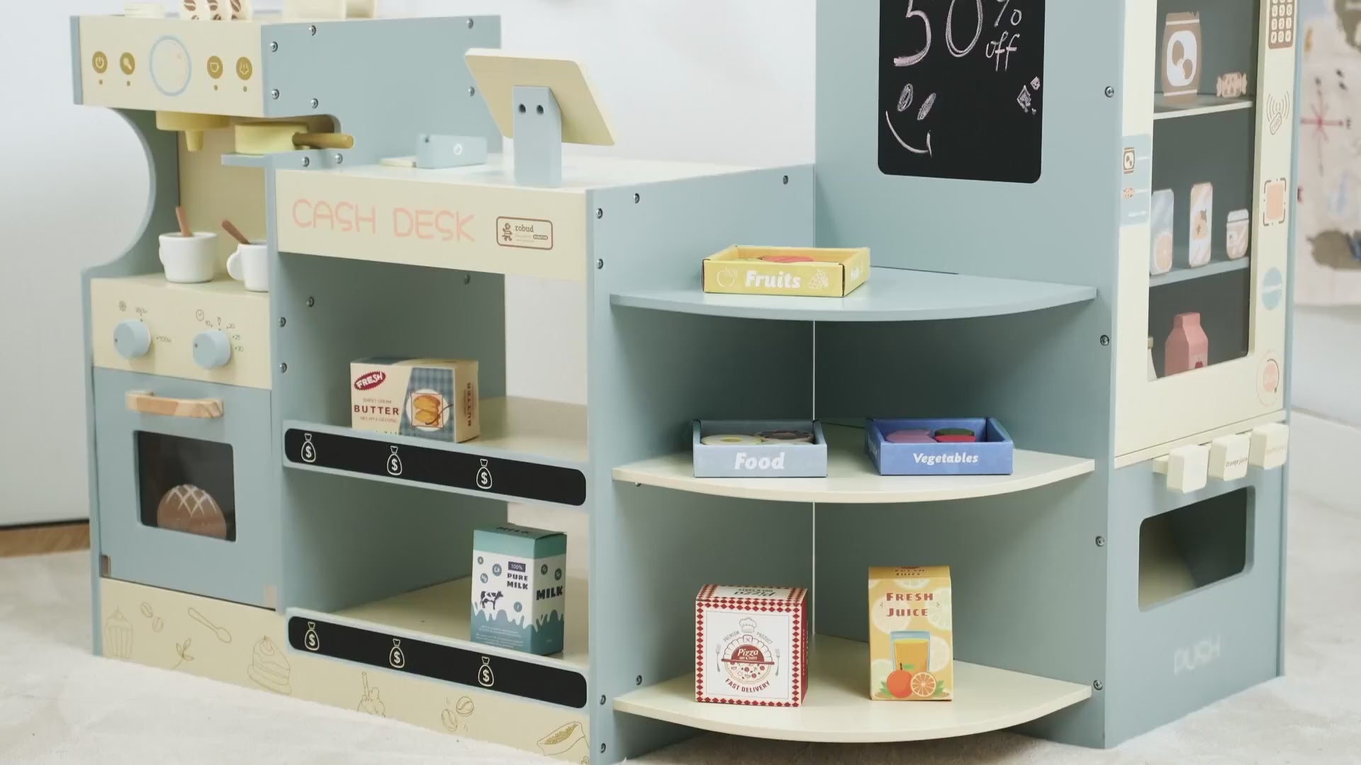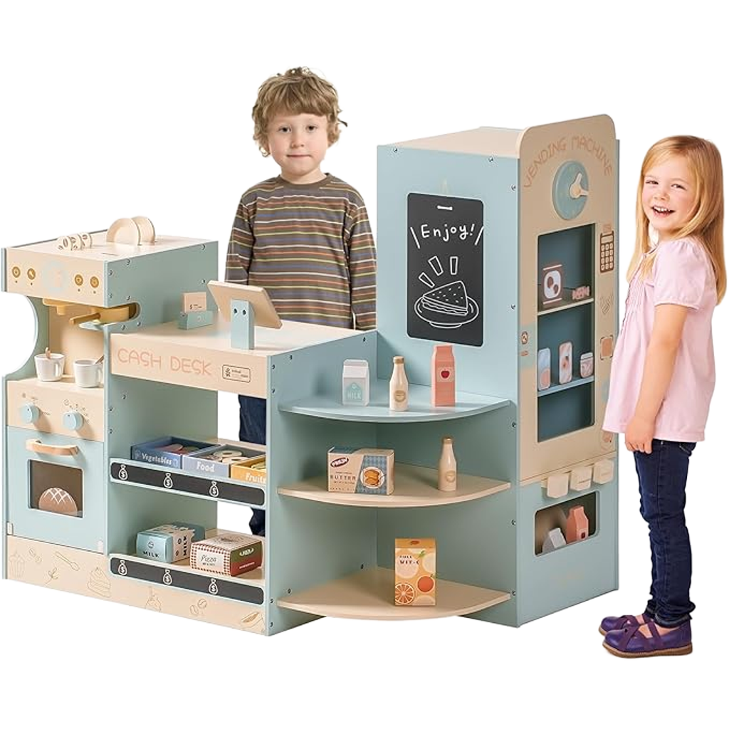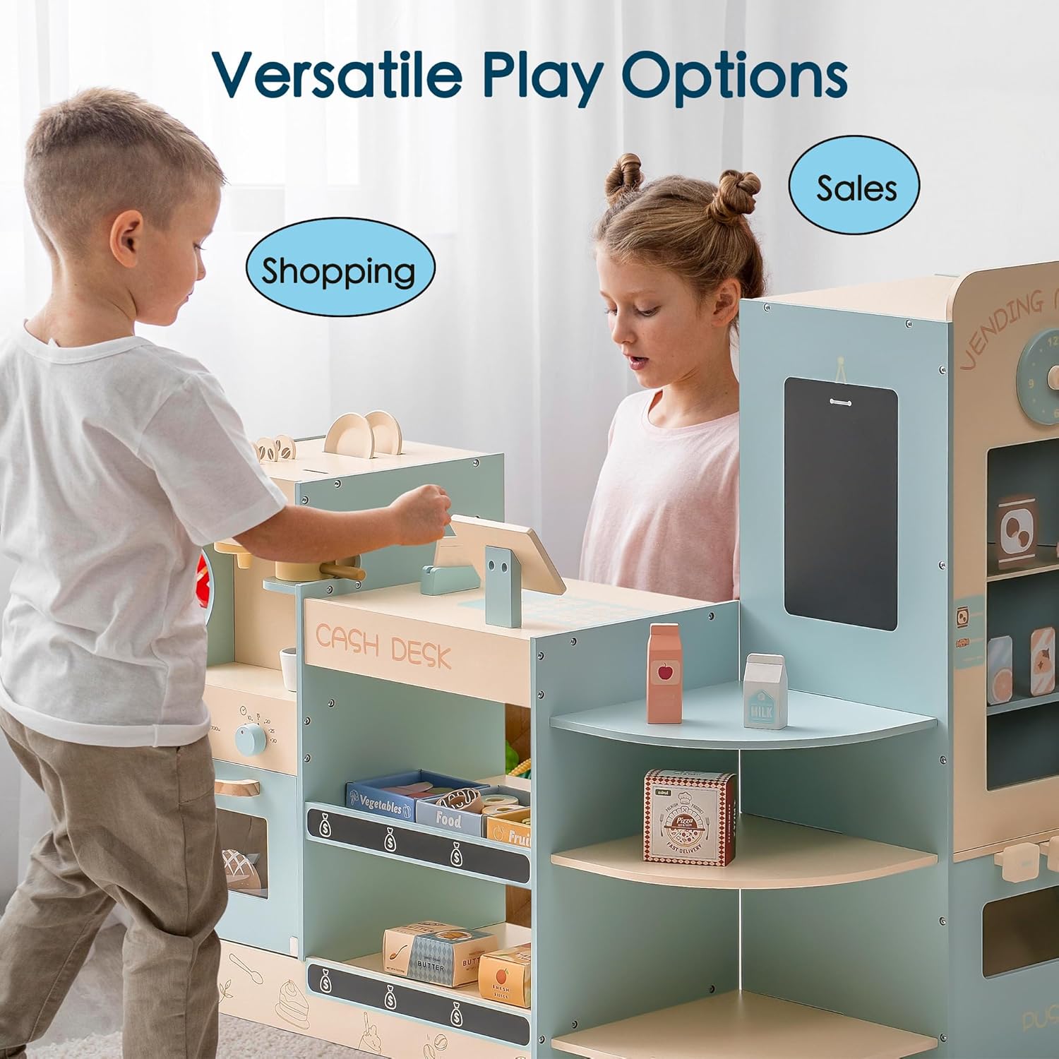 ROBOTIME-ის საბავშვო სასურსათო მაღაზია, სათამაშო სუპერმარკეტი სალაროთი, სავაჭრო აპარატით, ბავშვის ყავის მადუღარა და საკვების დასაჭრელი, სასურსათო მაღაზიის სათამაშო ნაკრები პატარა ბიჭებისთვის და გოგონებისთვის